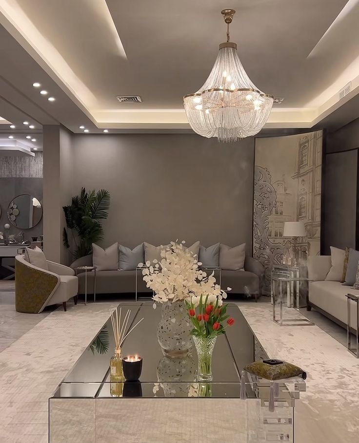 - تصاميم الإضاءة المخفية تشمل دمج الإضاءة داخل السقف بشكل مبتكر باستخدام إضاءات LED مخفية تضفي إضاءة هادئة وجذابة، هذا النوع يبرز جمال الصالون ويعزز من الديكور العام.