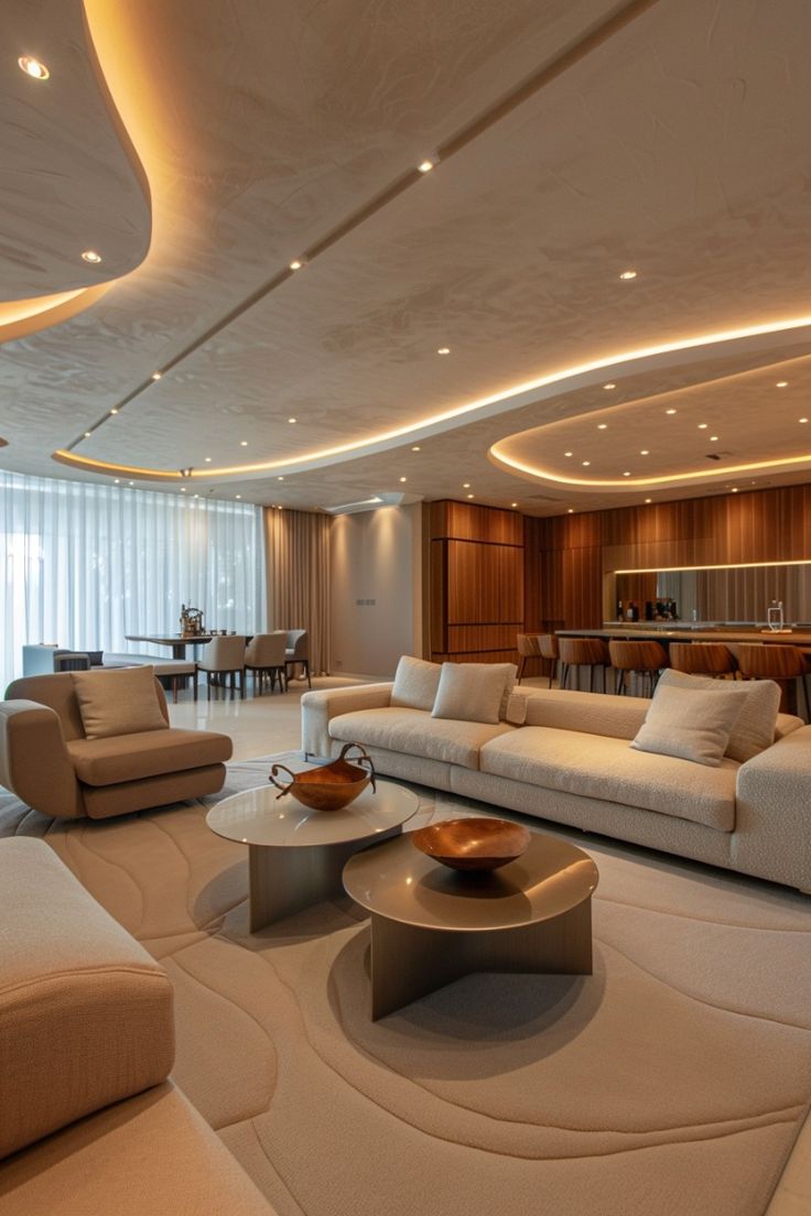 تتميز هذه الأسقف بأنها تعطي إضاءة غير مباشرة وهادئة، مما يعزز من راحة المكان ويوفر أجواء مثالية للاسترخاء أو العمل، يمكن أيضًا دمج الألوان المختلفة للإضاءة للحصول على تأثيرات متنوعة تتناسب مع مزاج الغرفة.