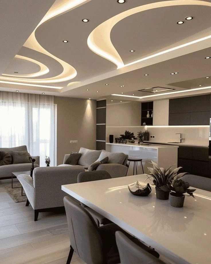 - تمنح الأشكال المنحنية مثل الدوائر أو الأقواس انطباع من النعومة والرقي، هذه التصاميم تعمل على تنعيم زوايا الغرف وتستخدم بشكل شائع في تصاميم الأسقف في غرف المعيشة أو الصالونات.