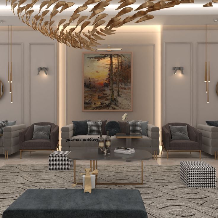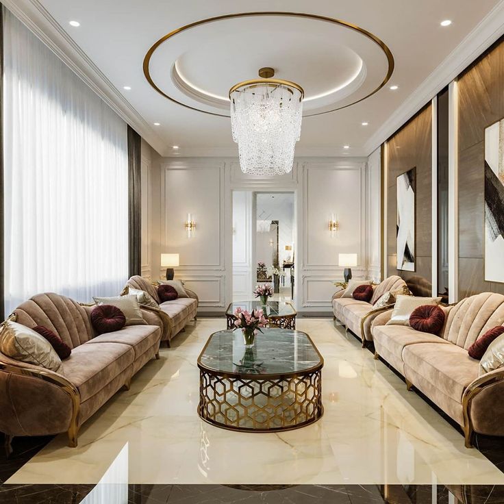 - غرف المعيشة: يمكن اختيار تصاميم معقدة أو حتى دمج الأشكال المتداخلة مع إضاءة دافئة لإضافة جو من الفخامة.