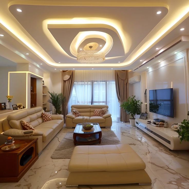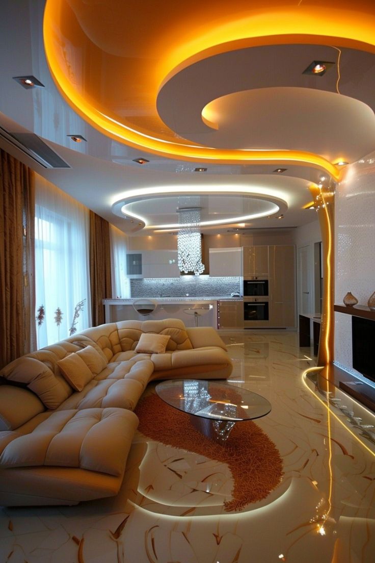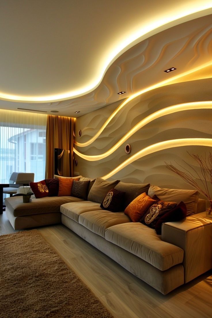 - من بين أكثر التصاميم رواج هي تلك التي تعتمد على دمج إضاءة LED مخفية داخل السقف الجبسي، هذه الإضاءة تضفي جو مميز وهادئ في المساء، وتخلق تأثير بصري جميل يبرز جمال السقف ويجعل المساحة تبدو أكثر اتساع.